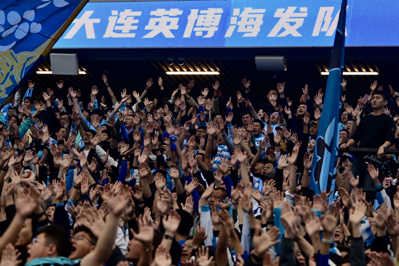 2025年11月22日,大连英博海发队球迷在比赛中为球队加油恭维。\n 当日,在辽宁大连举行的2025赛季中国足球协会超等联赛第30轮比赛中,上海海港队客场1比0校服大连英博海发队,获取本赛季中超联赛冠军。\n 新华社记者 吴青昊 摄
