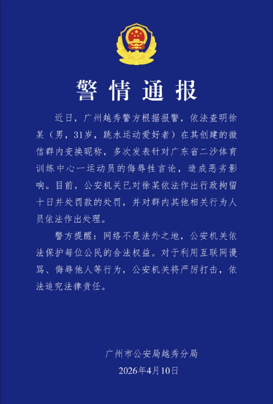 4月10日晚,广州越秀警方通报,徐某在其创建的微信群内屡次发表侮辱性言论,已被处以行政拘留10日并处罚金;警方同期明确,对群内其他关联活动东说念主员也已照章作出处理。此前,广东省二沙体育覆按中心已就针对全红婵的网罗暴力、坏心膺惩及乌有信息向公安机关报案,国度体育总局拍浮畅通管制中心也公开表态,坚强撑持照章维权,坚强抑遏乖张“饭圈”文化。