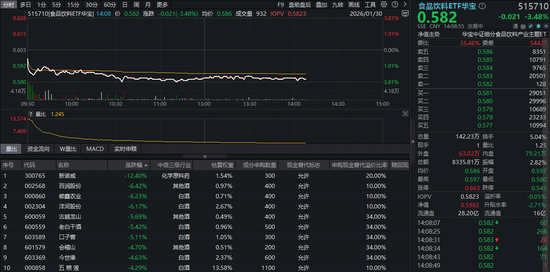 吃喝板块今日(1月30日)回调。反映吃喝板块整体走势的食品饮料ETF华宝(515710)开盘后迅速走弱,而后持续低位震荡,截至发稿,场内价格跌3.48%。