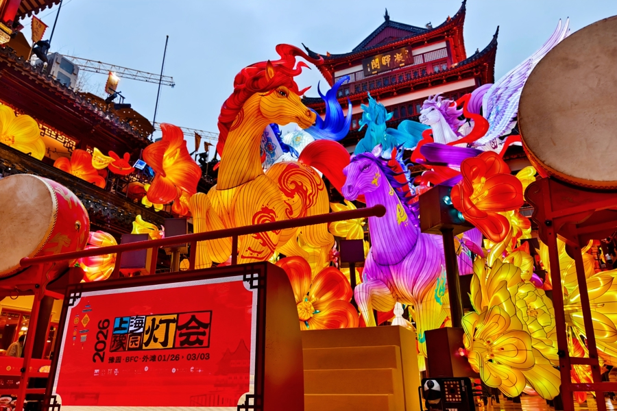 豫园的灯亮了,上海的年来了。夜幕降临,伴随着豫园商城中心广场“骏驰九州,步步生花”主灯组由暗转亮,只见复刻“盛唐六骏”的6匹战马玲珑剔透、各具风姿,吸引着广大游客市民驻足拍照……1月26日,以“来大豫园,过上海年”为主题的2026马年豫园新春灯会正式亮灯,并将持续至3月3日。