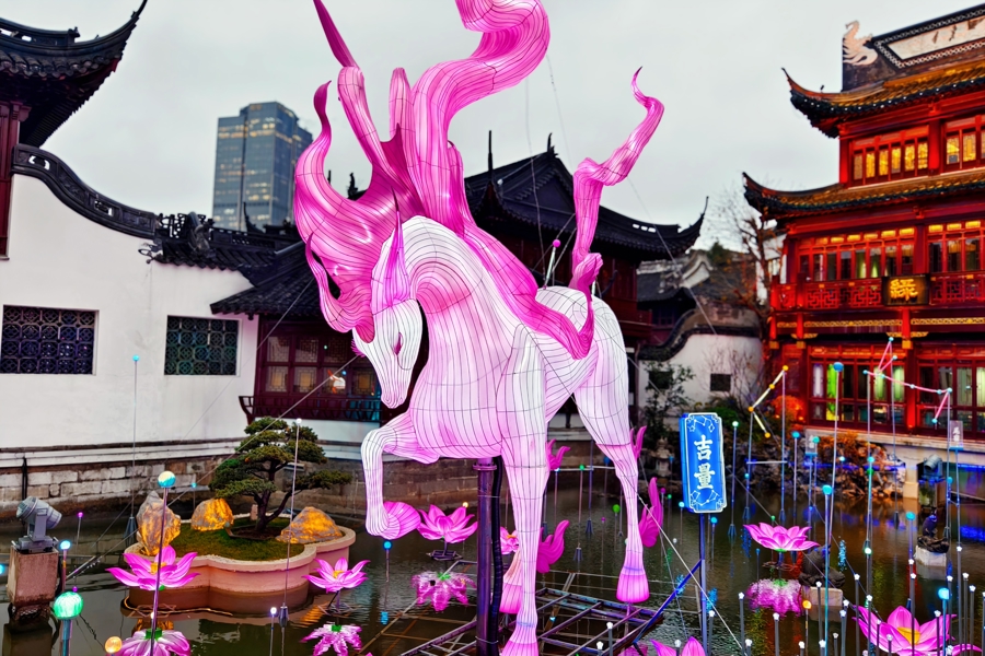 其中,作为亮灯起点的豫园民俗艺术灯区,今年推出《山海奇豫记》第四季《旷野篇》,以“以梦为马,旷野生花”为主题。中心广场“骏驰九州”、九曲桥“马跃星河”等大型灯组,融合非遗灯彩与数智光影,营造出可步入、可触摸的东方美学意境。
