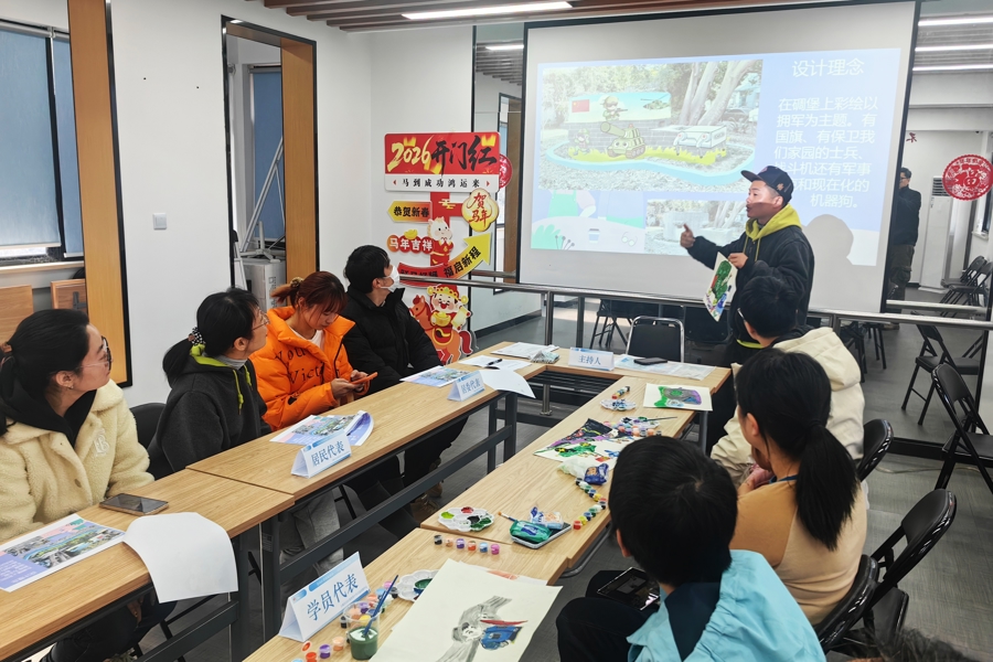 经过前期准备,刘俊和学员们围绕“社区记忆+时代新意”这一主线,打磨出两套创意方案:一是以“老碉堡新生”为理念,将淞沪会战时期遗留的社区小碉堡,创意转化为“复古军绿色越野车”造型,通过主题彩绘,融入智能机器人、VR体验、家庭温馨互动等时代元素;二是聚焦“国防文化+科技强国”主题,采用鲜活明快的卡通画风,让碉堡变身为“国防文化小景”,兼顾视觉美感与公共教育功能。