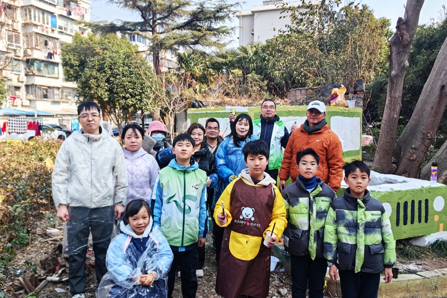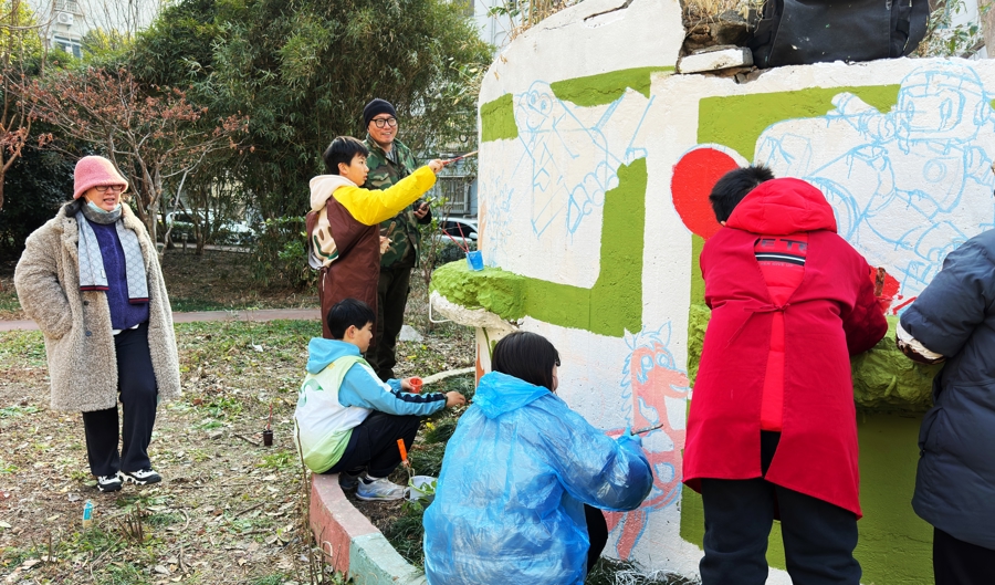 在开放式设计征询会上,青年学员向“老中青少”居民代表展示方案、听取反馈,让创意在对话中迭代优化。从图纸到墙面,大家与“社区小先生”亲子家庭结成“创意传帮带”——一起勾勒轮廓、分组填色。青年挥动滚筒铺陈底色,孩子执笔点缀生动细节。过程中,孩子的天真想象被留在了墙上,长者的生活印记也悄然融入画中。