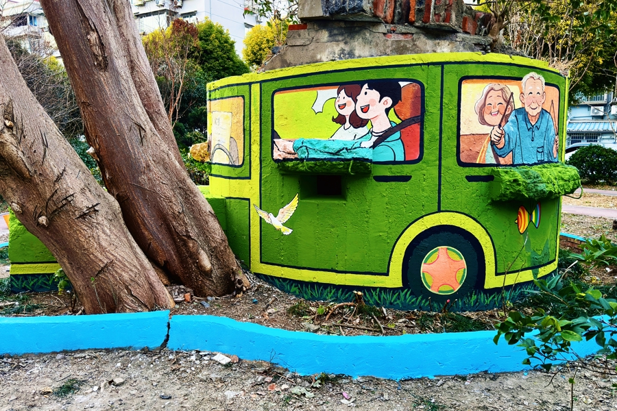 最近,宝山区庙行镇共康五村多了一个社区打卡点——一座承载着历史记忆的碉堡,披上了色彩鲜艳的“新衣”,复古军绿色的越野车造型,融入智能机器人、VR体验等元素。