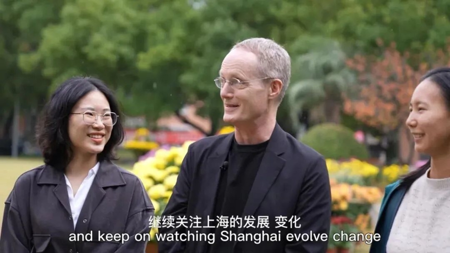 追思会伊始,全体与会者肃立,为伯恩斯先生默哀一分钟。随后,会场播放了特别制作的纪念影像。影像素材源自学院档案、教职工私人相册与学生课堂记录,自2014年学院初创至今,一幕幕画面串联起伯恩斯先生的身影:从开学典礼到院庆盛会,从日常课堂到工作会议,从团队协作到行走于中国城市的课余片段。这些温暖而真实的瞬间,勾勒出其十二年如一日扎根上海、奉献教育的生命轨迹,令在场师生无不动容。他曾坦言,最初只签订了两个月合同,却在教学与相处的过程中,深深爱上了中国,爱上了上海。