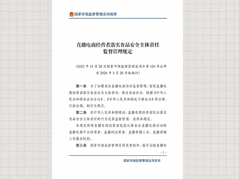 为了加强食物直播电商步履监督贬责,督促直播电商计较者落实食物安全主体包袱,国度商场监督贬责局《直播电商计较者落实食物安全主体包袱监督贬责规章》将于本年3月20日郑重实行。