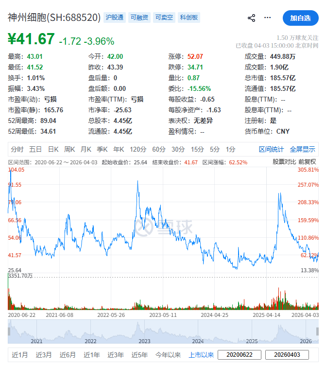 神州细胞(688520.SH)于2020年6月22日在A股上市,戒指周五(4月3日)收市,其总市值约185.57亿元东说念主民币。
