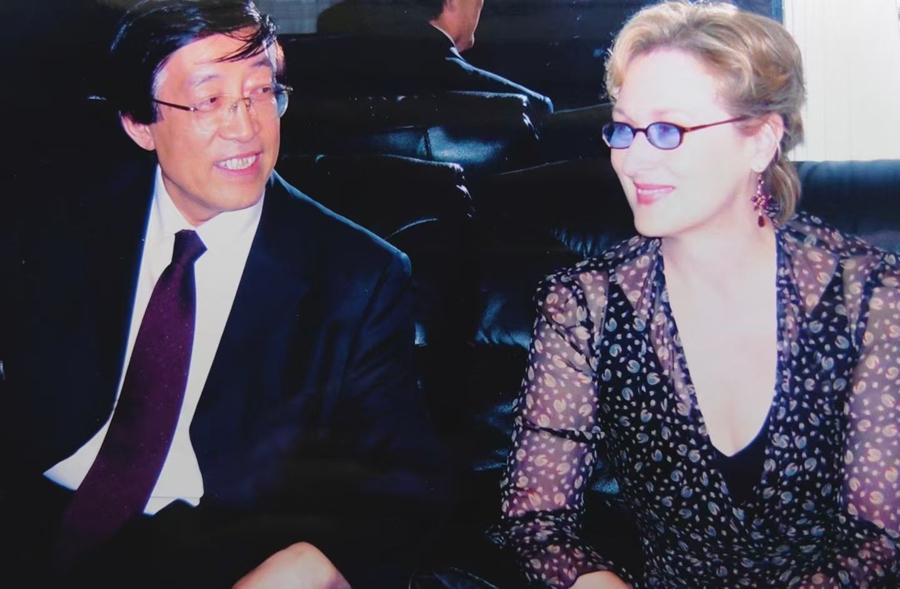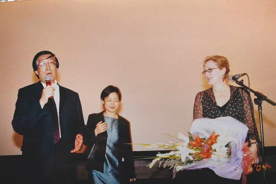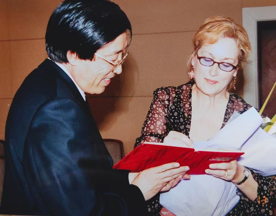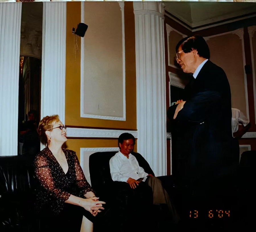 2004年,王佳彦在上海影城管待梅丽尔·斯特里普,并主合手了她主演的影片《平常刻刻》不雅众碰面会。(王佳彦 提供)