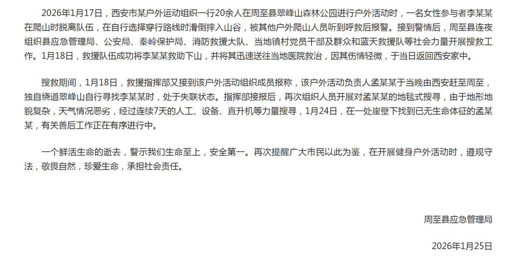 2026年1月17日,西安市某户外运动组织一行20余人在周至县翠峰山森林公园进行户外活动时,一名女性参与者李某某在爬山时脱离队伍,在自行选择穿行路线时滑倒摔入山谷,被其他户外爬山人员听到呼救后报警。接到警情后,周至县连夜组织县应急管理局、公安局、秦岭保护局、消防救援大队、当地镇村党员干部及群众和蓝天救援队等社会力量开展搜救工作。1月18日,救援队伍成功将李某某救助下山,并将其迅速送往当地医院救治,因其伤情轻微,于当日返回西安家中。