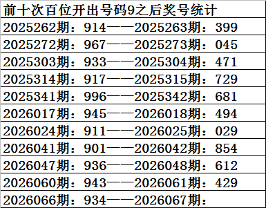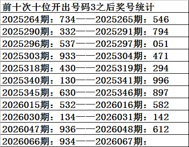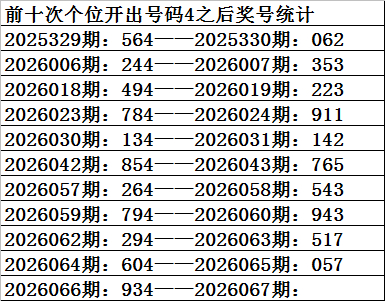一、上期开奖:福利彩票3D第2026066期奖号为934。奇偶比为2:1,大小比为:1:2,奖号和值为16,奖号跨度为6。