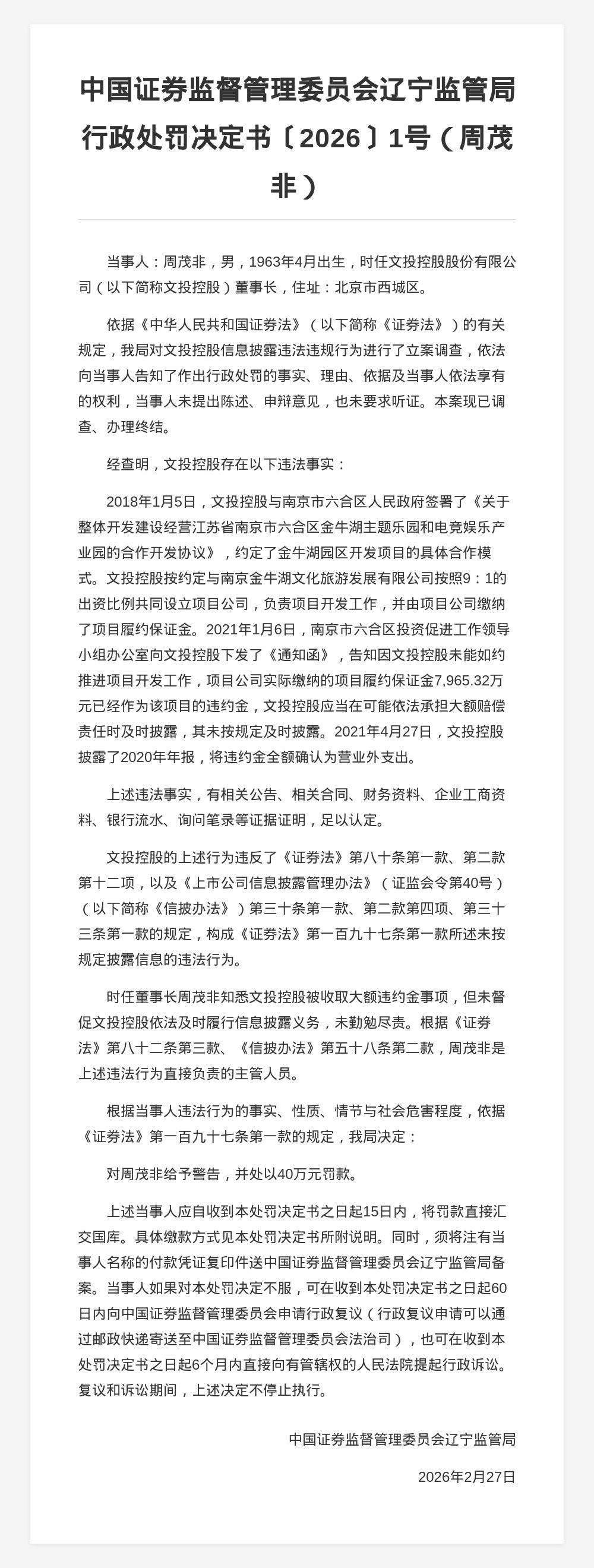 蓝鲸新闻2月27日讯,近日,中国证券监督处置委员会辽宁监管局发布了一则行政处罚决定书,对文投控股(维权)股份有限公司时任董事长周茂非进行了处罚。