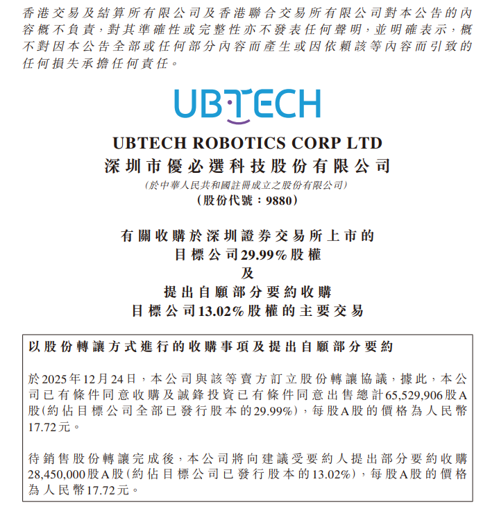 这次划定权变更的鼓吹速率超出市集预期,从2025年12月24日优必选与锋龙股份分裂发布公告,布告拟通过左券转让和要约收购的格式收购锋龙股份9395万股股份(占总股本的43%),到2026年3月12日锋龙股份公告股份左券转让完成,所有周期不到三个月。