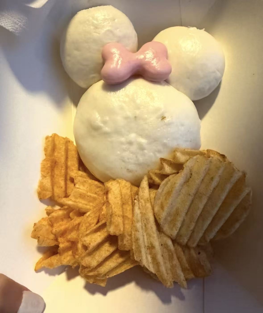 据网友刻画,这款米妮造型包子,两个耳朵和蝴蝶结均为实心馒头,瑞金资本脸部则有酱肉馅,搭配的薯片为“好风趣风趣”薯片。
